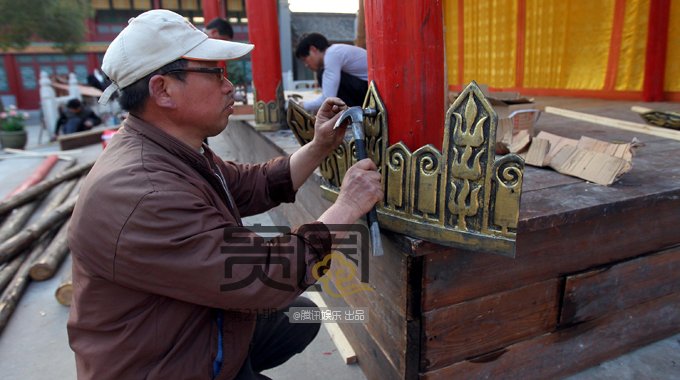 经常在电视上看到柱子上鎏金雕刻的装饰,则是临时安装上去的。