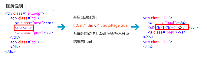 使用方法:需结合 titCell 使用,如果开启autoPage:true,此时titCell要指定为分页按钮的父层,因为系统会自动往titCell里面添加分页html!