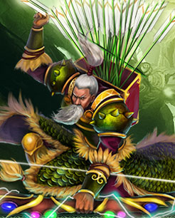 字汉升 南阳(今河南南阳)人。东汉末年名将。本为刘表部下中郎将,后归刘备,并助刘备攻益州刘璋。公元219年,黄忠在定军山一战中阵斩曹操部下名将夏侯渊,升任征西将军,刘备称汉中王后改封后将军,赐关内侯。次年,黄忠病逝,谥曰刚侯。黄忠在后世多以勇猛的老将形象出现于各类文学艺术作品中,《三国演义》里,刘备称汉中王后将其封为五虎上将之一,而黄忠的名字在中国也逐渐成为了老当益壮的代名词。