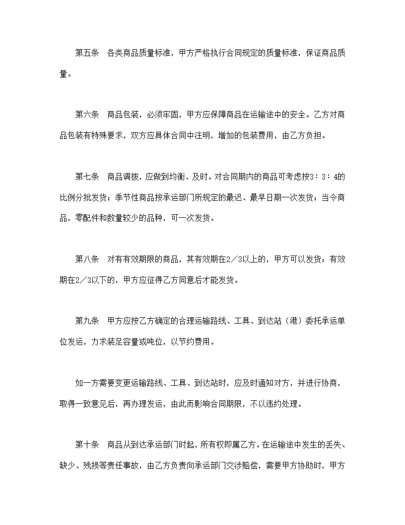 第六条 商品包装,必须牢固,甲方应保障商品在运输途中的安全。乙方对商品包装有特殊要求,双方应具体合同中注明,增加的包装费用,由乙方负担。
