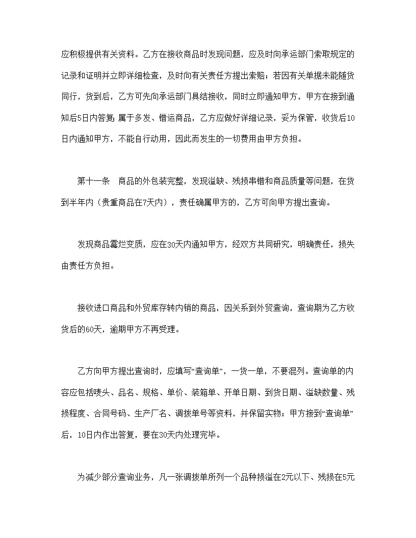 乙方向甲方提出查询时,应填写“查询单”,一货一单,不要混列。查询单的内容应包括唛头、品名、规格、单价、装箱单、开单日期、到货日期、溢缺数量、残损程度、合同号码、生产厂名、调拨单号等资料,并保留实物;甲方接到“查询单”后,10日内作出答复,要在30天内处理完毕。