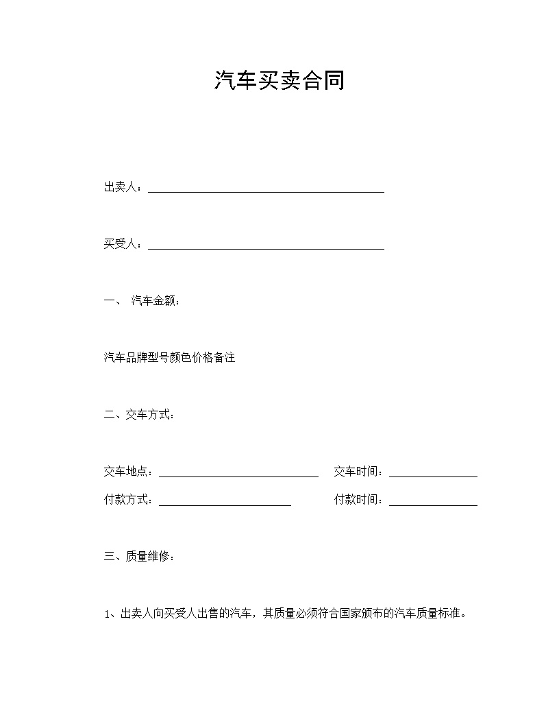 1、出卖人向买受人出售的汽车,其质量必须符合国家颁布的汽车质量标准。