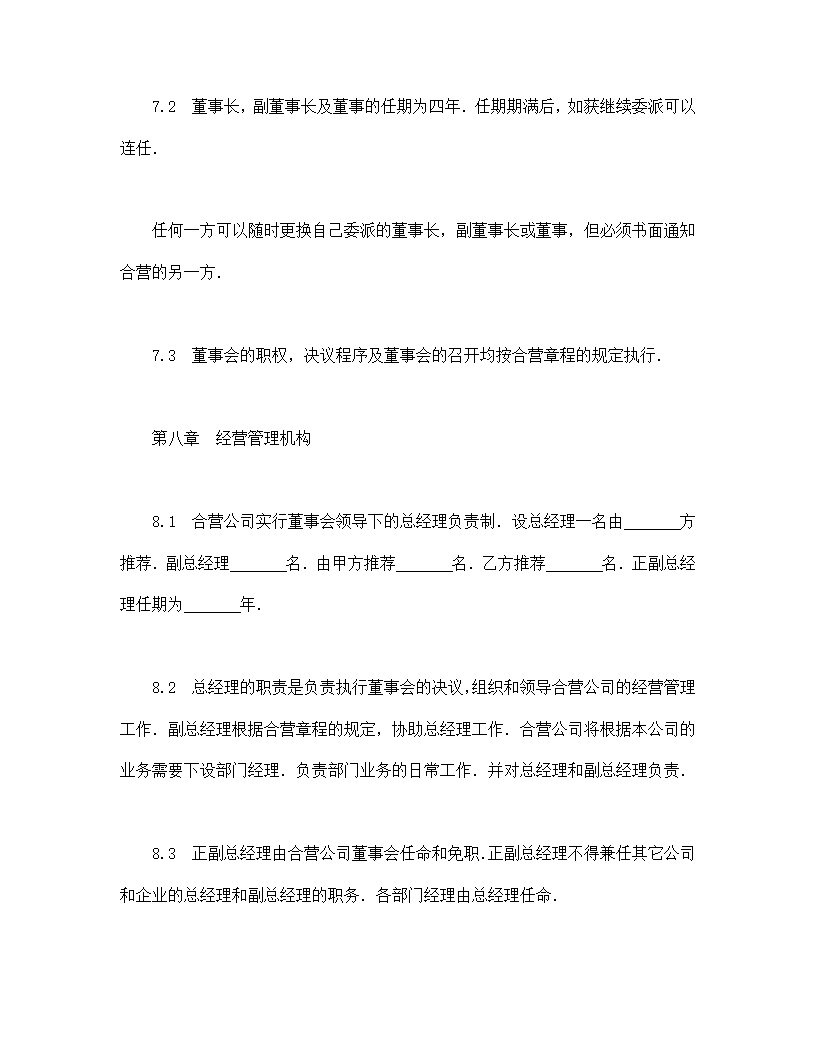 8.1 合营公司实行董事会领导下的总经理负责制.设总经理一名由 方推荐.副总经理 名.由甲方推荐 名.乙方推荐 名.正副总经理任期为 年.