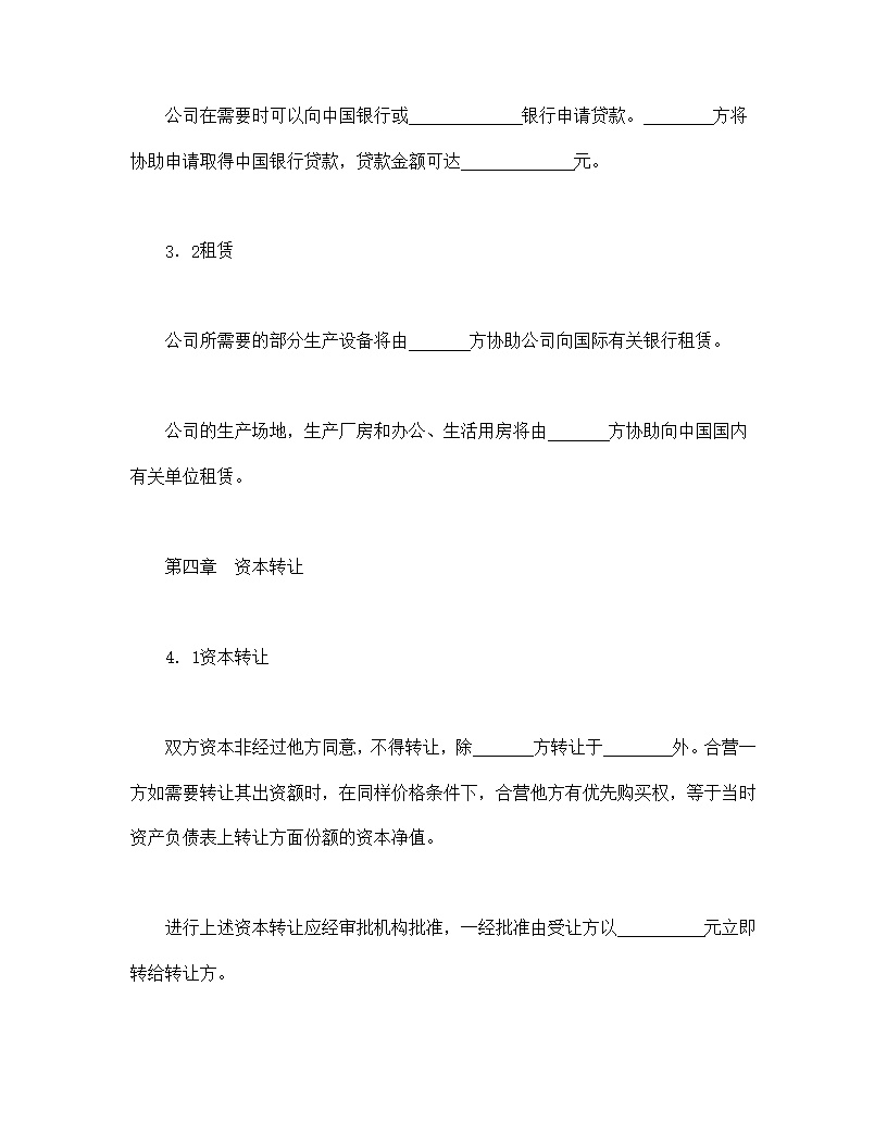 双方资本非经过他方同意,不得转让,除 方转让于 外。合营一方如需要转让其出资额时,在同样价格条件下,合营他方有优先购买权,等于当时资产负债表上转让方面份额的资本净值。