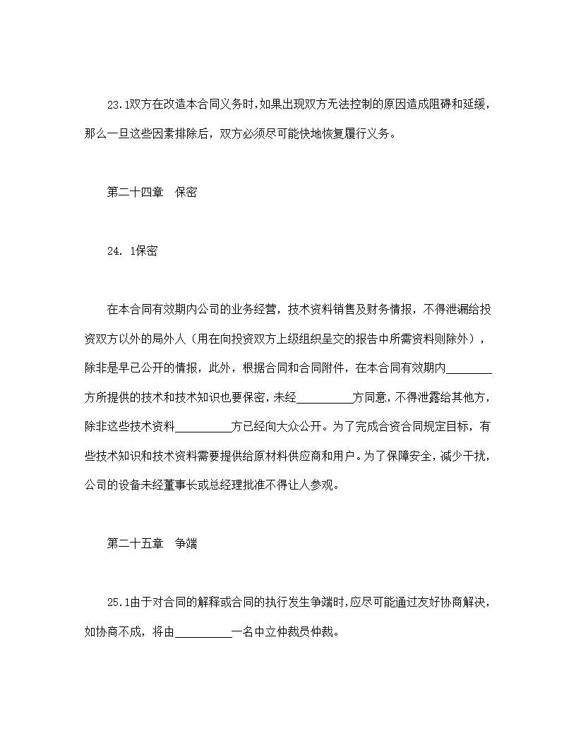 在本合同有效期内公司的业务经营,技术资料销售及财务情报,不得泄漏给投资双方以外的局外人(用在向投资双方上级组织呈交的报告中所需资料则除外),除非是早已公开的情报,此外,根据合同和合同附件,在本合同有效期内 方所提供的技术和技术知识也要保密,未经 方同意,不得泄露给其他方,除非这些技术资料 方已经向大众公开。为了完成合资合同规定目标,有些技术知识和技术资料需要提供给原材料供应商和用户。为了保障安全,减少干扰,公司的设备未经董事长或总经理批准不得让人参观。