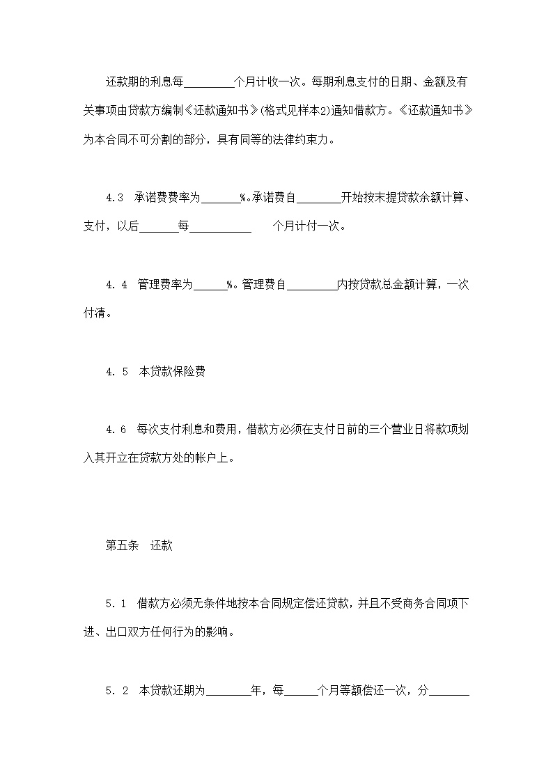 4.3 承诺费费率为 %。承诺费自 开始按末提贷款余额计算、支付,以后 每 个月计付一次。