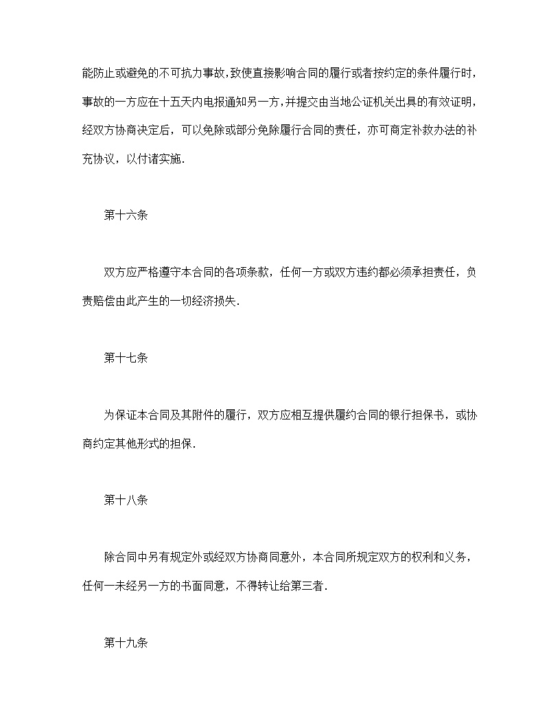 由于地震,台风,水灾,火灾,战争以及其他不能预见并且对其发生和后果不能防止或避免的不可抗力事故,致使直接影响合同的履行或者按约定的条件履行时,事故的一方应在十五天内电报通知另一方,并提交由当地公证机关出具的有效证明,经双方协商决定后,可以免除或部分免除履行合同的责任,亦可商定补救办法的补充协议,以付诸实施.