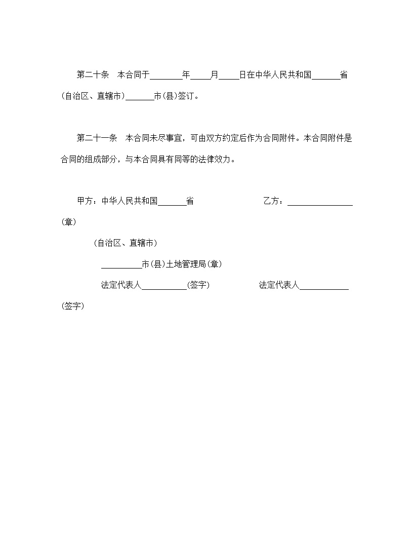 中华人民共和国 省(自治区、直辖市) 市(县)土地管理局(以下简称甲方),法定地址 ;邮政编码 ;法定代表人:姓名 职务 。