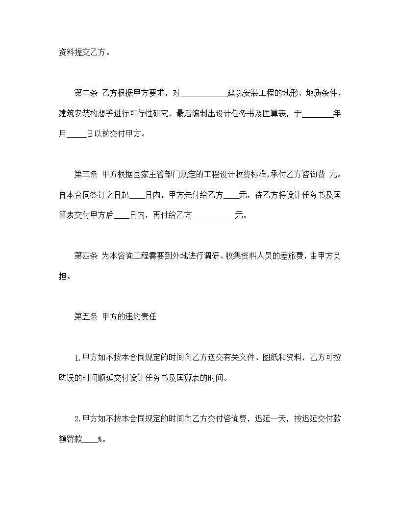 1.乙方如不按本合同规定的时间交付设计任务书及匡算表,迟延一天,按总咨询费金额罚款____%。