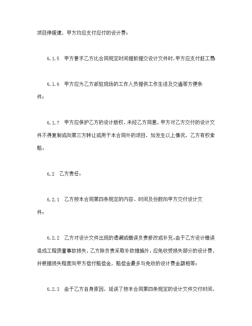6.1.1 甲方按本合同第三条规定的内容,在规定的时间内向乙方提交资料及文件,并对其完整性、正确性及时限负责。