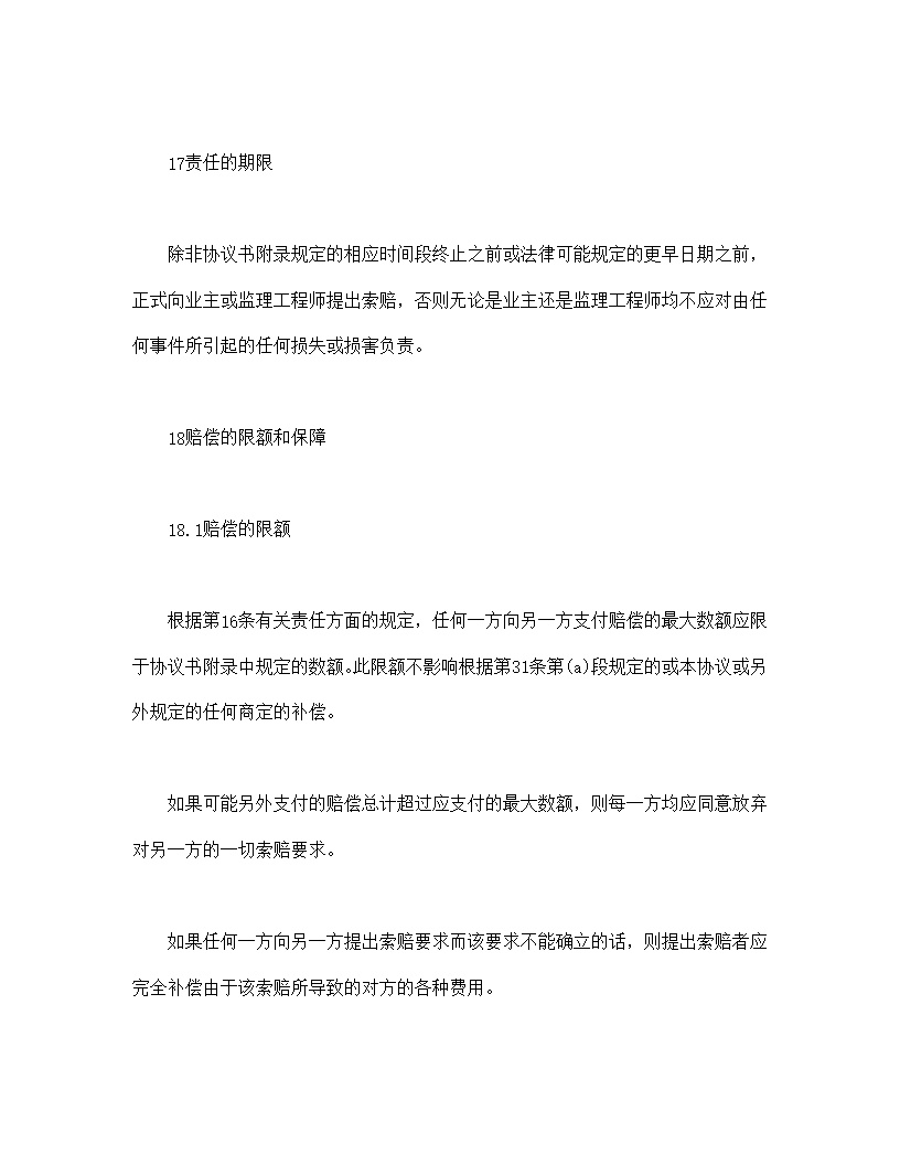 除非协议书附录规定的相应时间段终止之前或法律可能规定的更早日期之前,正式向业主或监理工程师提出索赔,否则无论是业主还是监理工程师均不应对由任何事件所引起的任何损失或损害负责。