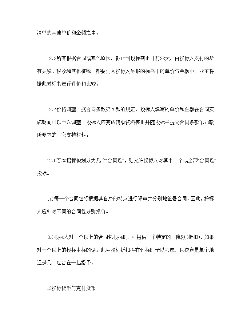 12.3所有根据合同或其他原因,截止到投标截止日前28天,由投标人支付的所有关税、税收和其他征税,都要列入投标入呈报的标书中的单价与金额中。业主将据此对标书进行评价和比较。