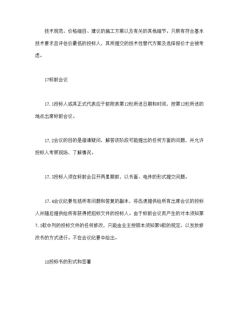 技术规范、价格细目、建议的施工方案以及有关的其他细节。只限有符合基本技术要求且评估价最低的投标人,其所提交的技术性替代方案及选择报价才会被考虑。