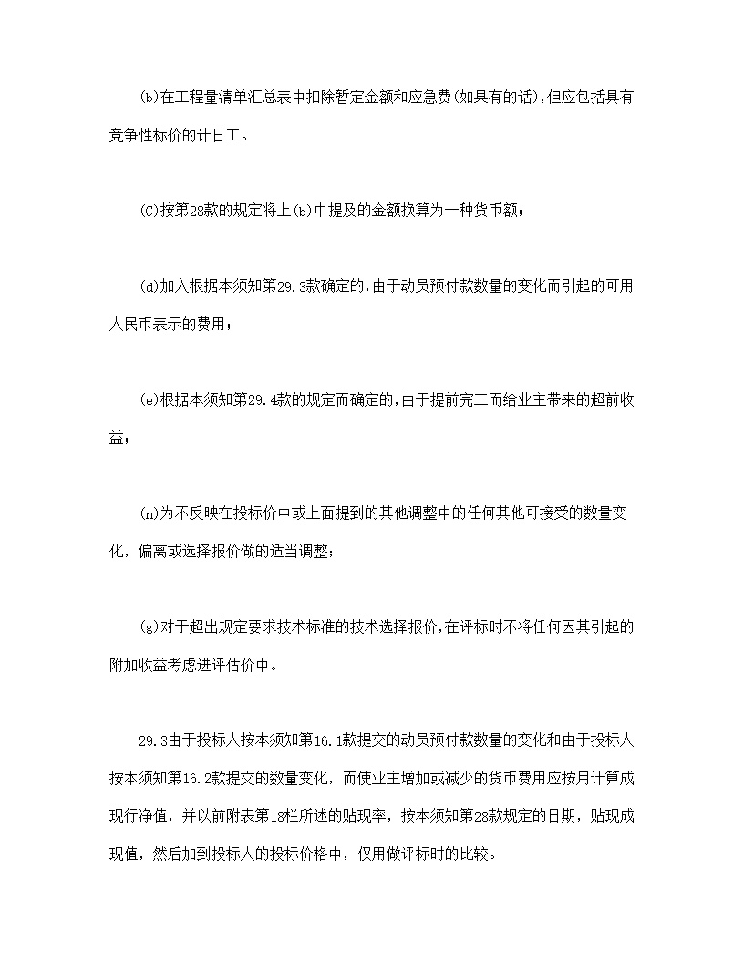 29.3由于投标人按本须知第16.1款提交的动员预付款数量的变化和由于投标人按本须知第16.2款提交的数量变化,而使业主增加或减少的货币费用应按月计算成现行净值,并以前附表第18栏所述的贴现率,按本须知第28款规定的日期,贴现成现值,然后加到投标人的投标价格中,仅用做评标时的比较。