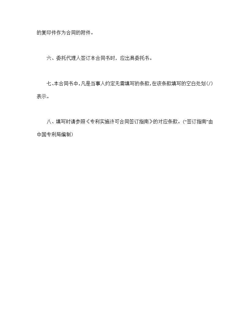 八、填写时请参照《专利实施许可合同签订指南》的对应条款。(“签订指南”由中国专利局编制)