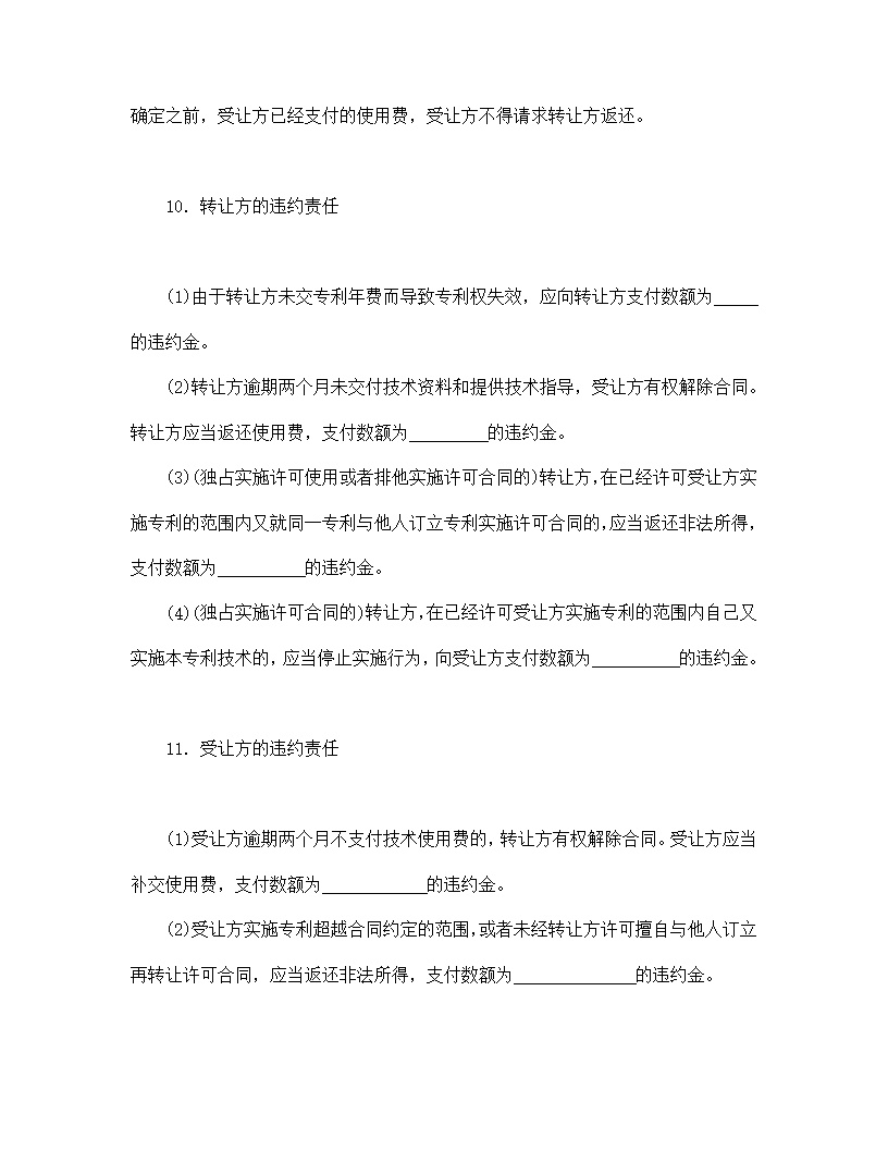 (4)(独占实施许可合同的)转让方,在已经许可受让方实施专利的范围内自己又实施本专利技术的,应当停止实施行为,向受让方支付数额为 的违约金。