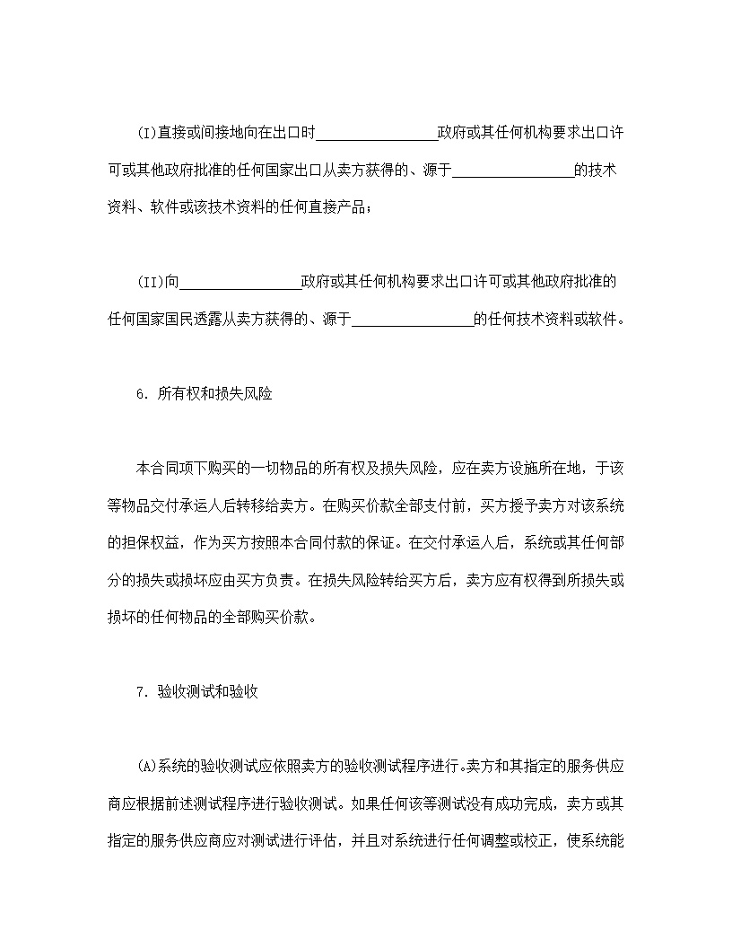 本合同项下购买的一切物品的所有权及损失风险,应在卖方设施所在地,于该等物品交付承运人后转移给卖方。在购买价款全部支付前,买方授予卖方对该系统的担保权益,作为买方按照本合同付款的保证。在交付承运人后,系统或其任何部分的损失或损坏应由买方负责。在损失风险转给买方后,卖方应有权得到所损失或损坏的任何物品的全部购买价款。