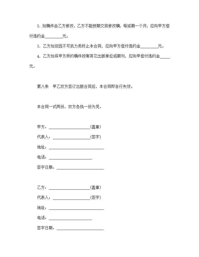 2.如稿件由乙方修改,乙方不能按期交回修改稿,每延期一个月,应向甲方偿付违约金 元。