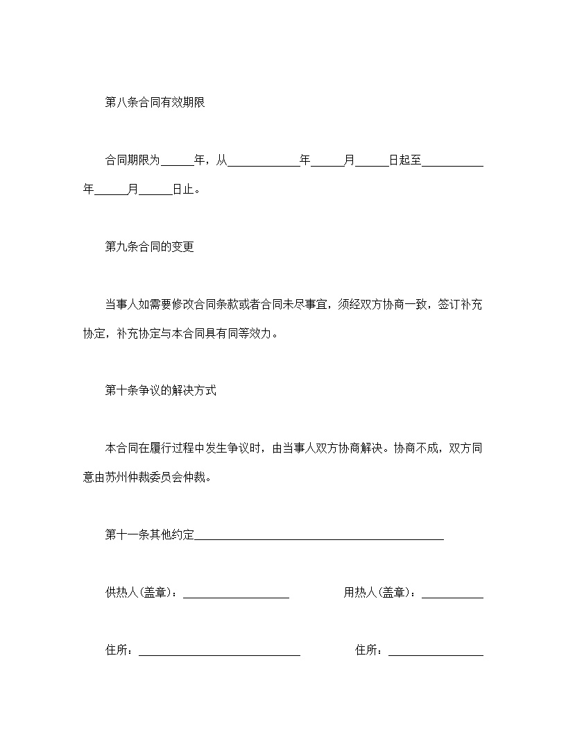 (一)供热人在地方政府规定的供热期限内为用热人供热。冬季供热时间为每年________月_____日起至次年_______月__________日止。