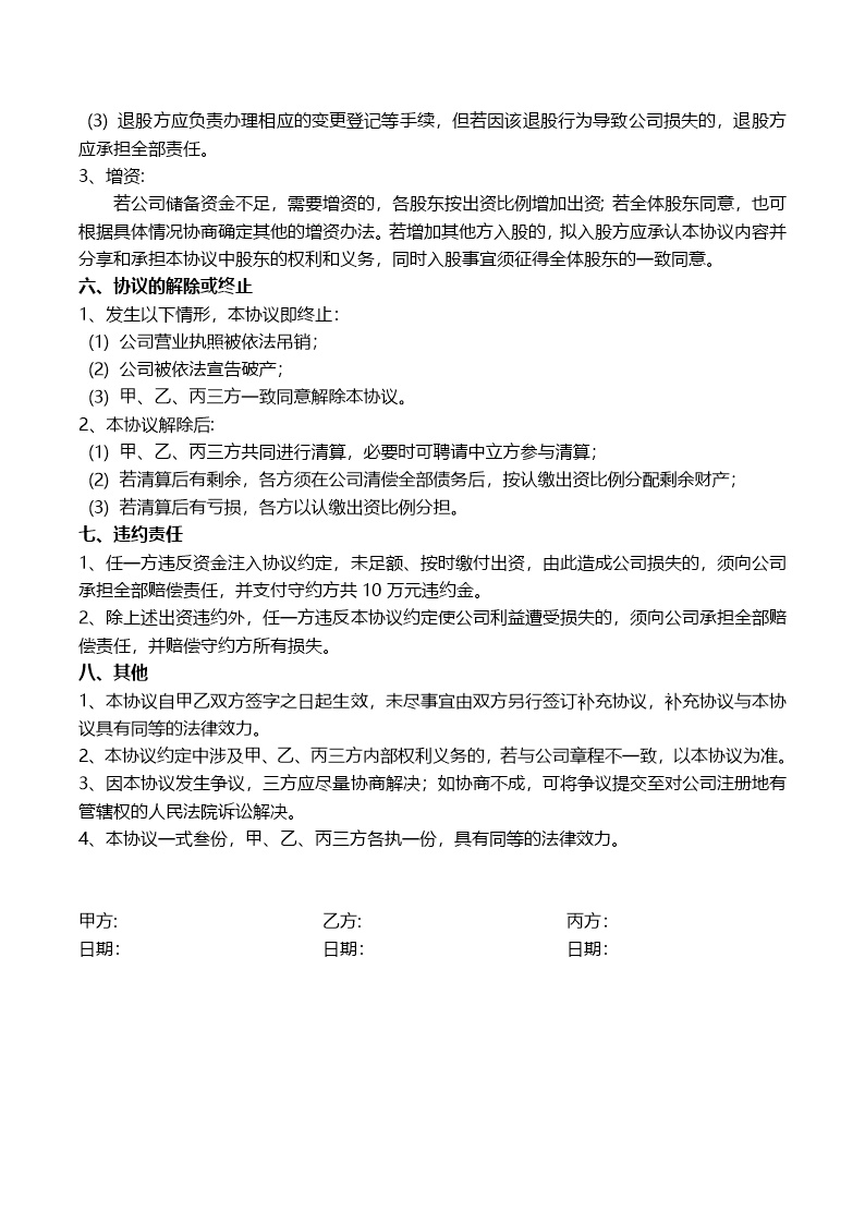 1、任一方违反资金注入协议约定,未足额、按时缴付出资,由此造成公司损失的,须向公司承担全部赔偿责任,并支付守约方共10万元违约金。