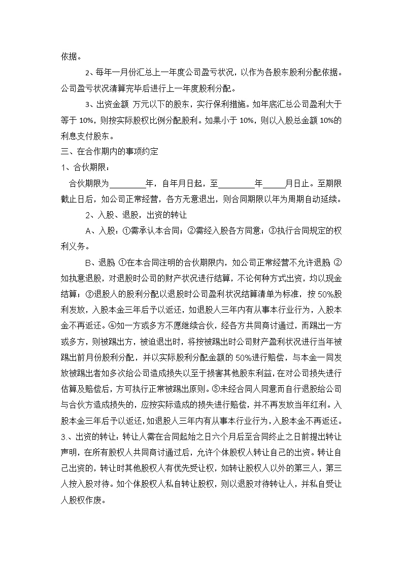 B、退股:①在本合同注明的合伙期限内,如公司正常经营不允许退股;②如执意退股,对退股时公司的财产状况进行结算,不论何种方式出资,均以现金结算;③退股人的股利分配以退股时公司盈利状况结算清单为标准,按50%股利发放,入股本金三年后予以返还,如退股人三年内有从事本行业行为,入股本金不再返还。④如一方或多方不愿继续合伙,经各方共同商讨通过,而踢出一方或多方,则被踢出方,被迫退出时,将按被踢出时公司财产盈利状况进行当年被踢出前月份股利分配,并以实际股利分配金额的50%进行赔偿,与本金一同发放被踢出者如多次给公司造成损失以至于损害其他股东利益,在对公司损失进行估算及赔偿后,方可执行正常被踢出原则。⑤未经合同人同意而自行退股给公司与合伙方造成损失的,应按实际造成的损失进行赔偿,并不再发放当年红利。入股本金三年后予以返还,如退股人三年内有从事本行业行为,入股本金不再返还。