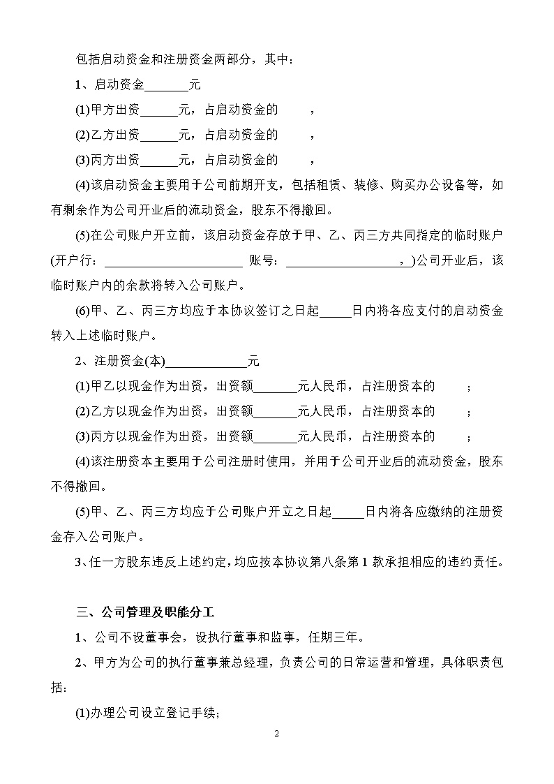 (5)在公司账户开立前,该启动资金存放于甲、乙、丙三方共同指定的临时账户(开户行: 账号: ,)公司开业后,该临时账户内的余款将转入公司账户。