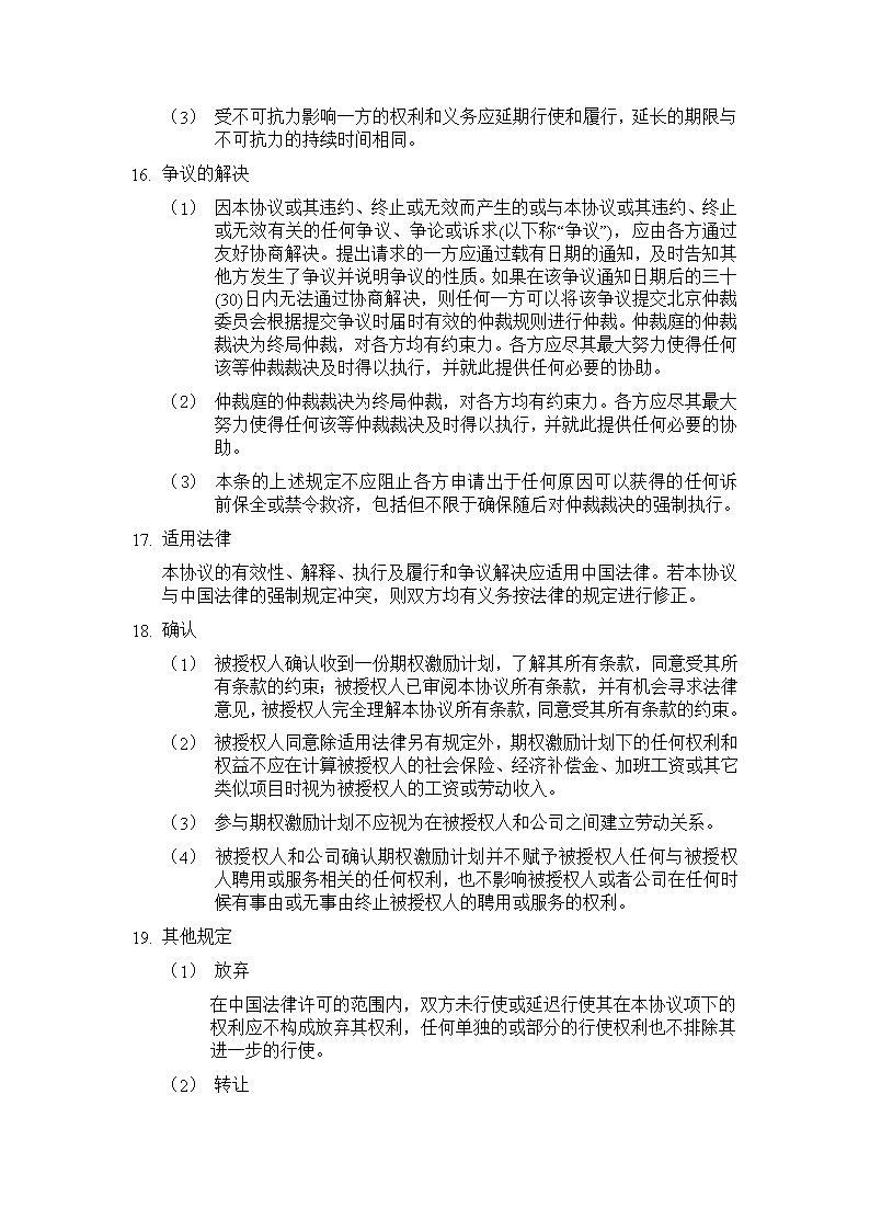 (1) 被授权人确认收到一份期权激励计划,了解其所有条款,同意受其所有条款的约束;被授权人已审阅本协议所有条款,并有机会寻求法律意见,被授权人完全理解本协议所有条款,同意受其所有条款的约束。