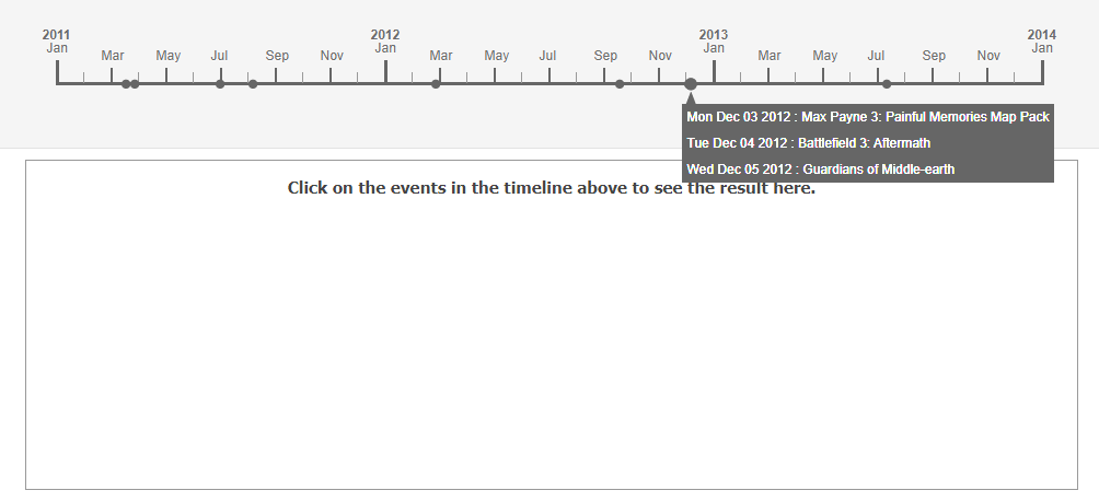 <h3 ><span id="date_123" style="color:red"></span> <span id="event_title_123">Click on the events in the timeline above to see the result here.</span></h3>