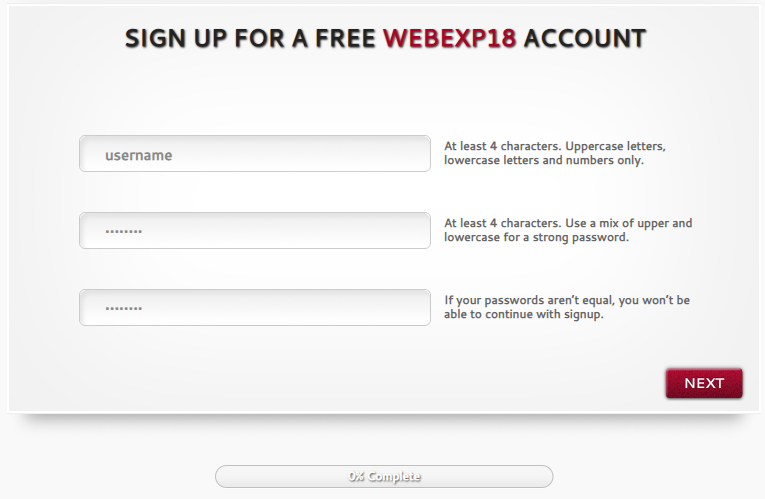 <h1>SIGN UP FOR A FREE <span>WEBEXP18</span> ACCOUNT</h1>