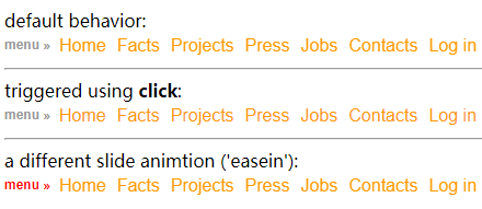 // transitions:easein,easeout,easeboth,bouncein,bounceout,// bounceboth,elasticin,elasticout,elasticboth transition:'bounceout',// trigger events:mouseover,mousedown,mouseup,click,dblclick triggerEvent:'mouseover',// number of ms to delay before hiding menu (on page load) loadHideDelay:1000,// number of ms to delay before hiding menu (on mouseout) blurHideDelay:500,// number of ms for transition effect effectDuration:1000,// hide the menu when the page loads hideOnLoad:true,// automatically hide menu when mouse leaves area autoHide:true}