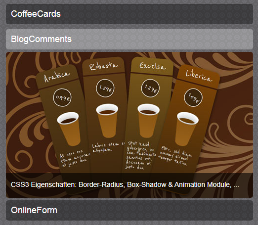 <p><span>CSS3 Eigenschaften: MediaQueries, Transform & Transition Modules, ...</span></p>